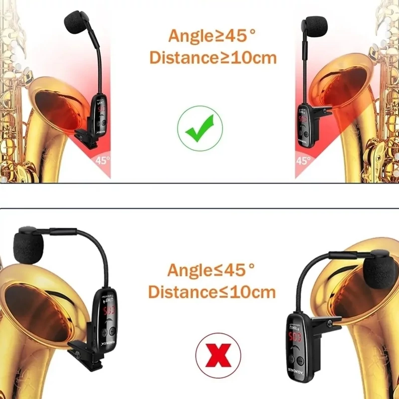 میکرفون تخصصی سازهای ساکسیفون ترمپت ترمبون قرنی یا هما کلارینت و...... میکروفون به طور همزمان بدون تداخل با یکدیگر استفاده کنید. صفحه نمایش دیجیتال LED —▬▬▬▬ ميكروفون ابزار بی سیم با نمایشگر دیجیتال LED برای مشاهده آسان فرکانس سطح باتری صدا گیره چرخان 360 درجه به راحتی بر روی تجهیزات آلات موسیقی ثابت میشود و گیره ضد ضربه سیلیکونی میتواند به طور موثر سر و صدای تولید شده توسط ارتعاش تجهیزات آلات موسیقی را فیلتر کند ميكروفون با حساسیت بالا میکروفن خازنی با حساسیت بالا به خوبی ستون صدای ساز را ضبط کند و صدا را واضح تر و واقعی تر می کند. می طیف گستردهای از برنامهها میکروفون های بی سیم با تقویت کنندهها سیستمهای بلندگو و غیره سازگار هستند مناسب برای کنسرت اجرای گروه تمرین ،فردی تمرین باند مناسب برای ترومپت ،توبا ،هورن ترومبون، ساکسیفون کلارینت و سایر برنج ها ▬▬▬ شارژ سریع USB باتری قابل شارژ داخلی 400 میلی آمپر ساعتی به مدت 2 ساعت به مدت 5-6 ساعت شارژ میشود چراغ قرمز هنگام شارژ روشن است و چراغ قرمز در هنگام شارژ كامل خاموش میشود A
