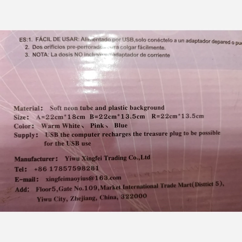 مواد: لوله نئون نرم و پس زمینه پلاستیکی اندازه: a = 22cm*18cm b = 22cm*13.5cm r = 22cm*13.5cm رنگ: سفید گرم رنگ آبی عرضه: USB رایانه پلاگین گنج را شارژ می کند تا امکان پذیر باشد برای استفاده USB سازنده: شرکت Trading Yiwu Xingfei (بار آمازون )