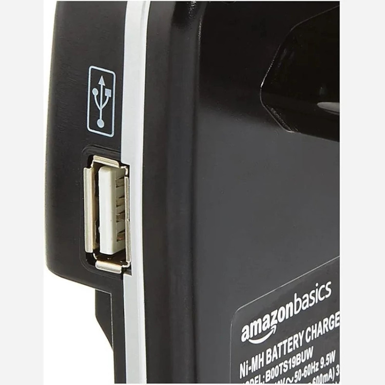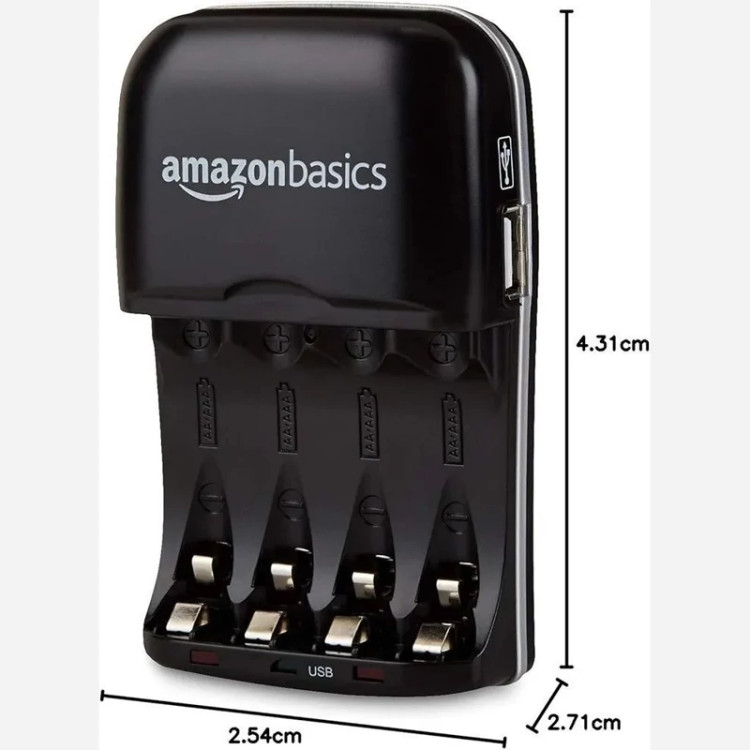 Amazon Basics چهار اسلات شارژر باتری Ni-MH AA و AAA با LED های نشانگر، دارای پورت USB، مشکی