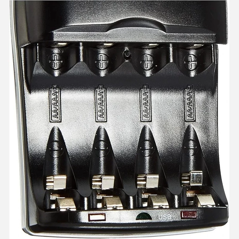 Amazon Basics چهار اسلات شارژر باتری Ni-MH AA و AAA با LED های نشانگر، دارای پورت USB، مشکی