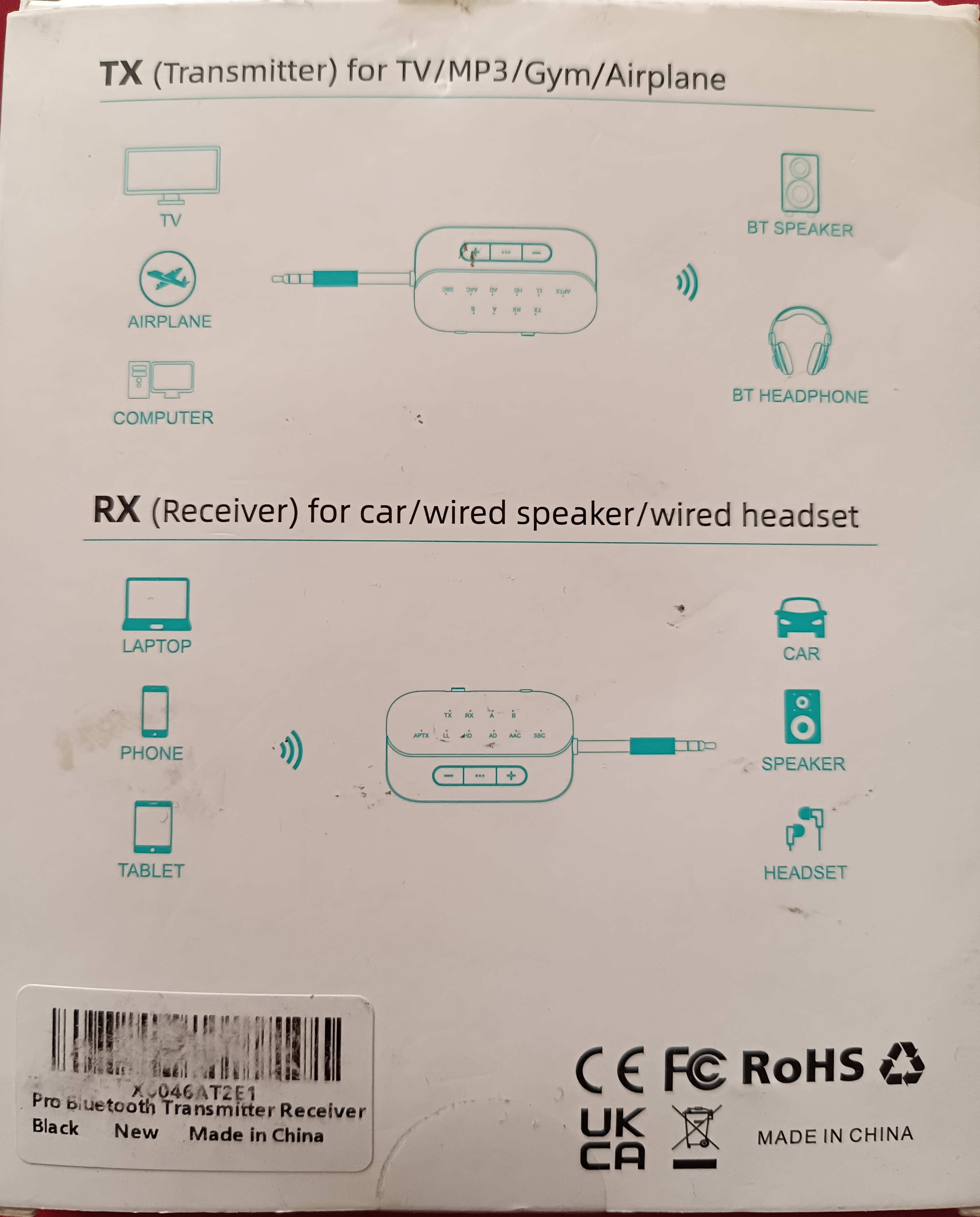 گیرنده فرستنده بلوتوث ۲ در ۱: در حالت TX، فرستنده بلوتوث به شما این امکان را میدهد که صدا را از تلویزیون، رایانه شخصی، سیستمهای سرگرمی هواپیما به هدفونهای بلوتوث، هندزفریها و بلندگوهای بلوتوث از طریق کابل ۳.۵ میلیمتری منتقل کنید. یک آداپتور AUX دوگانه ۳.۵ میلیمتری اضافی برای سازگاری بهتر با رابطهای صوتی مختلف هواپیما ارائه میشود. در حالت RX، گیرنده بلوتوث به شما امکان میدهد تلفن هوشمند خود را به صورت بیسیم از طریق بلوتوث به بلندگوهای سیمی، هدفون، استریو ماشین یا استریو خانگی متصل کنید.
