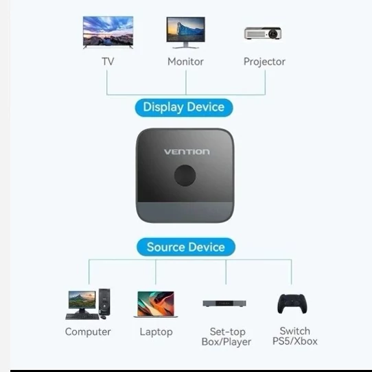 با استفاده از سوئیچ دو طرفه Vention میتوانید حداکثر دو دستگاه را به یک صفحه نمایش متصل کنید، بدون اینکه کیفیت تصویر به دلیل پشتیبانی از وضوح 4K در 60 هرتز کاهش یابد.